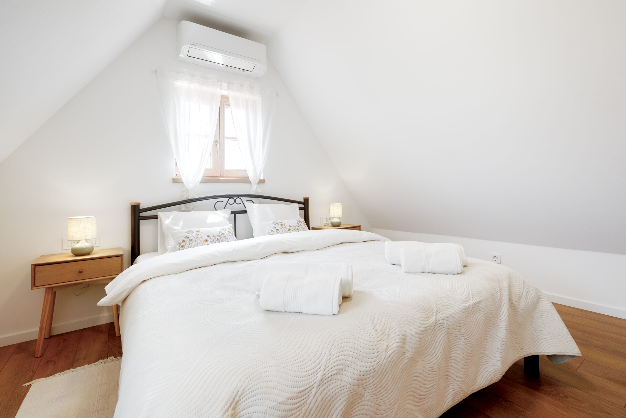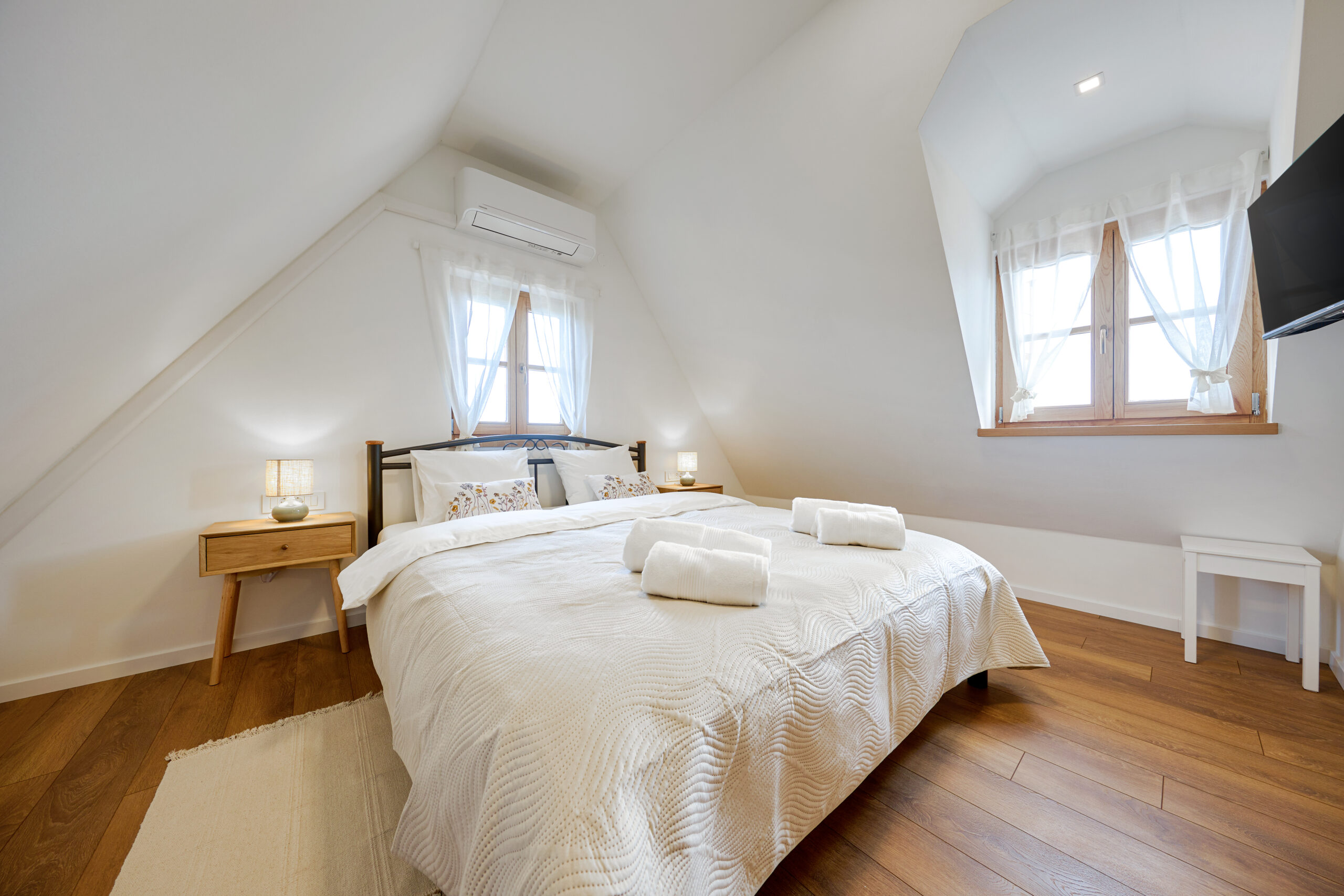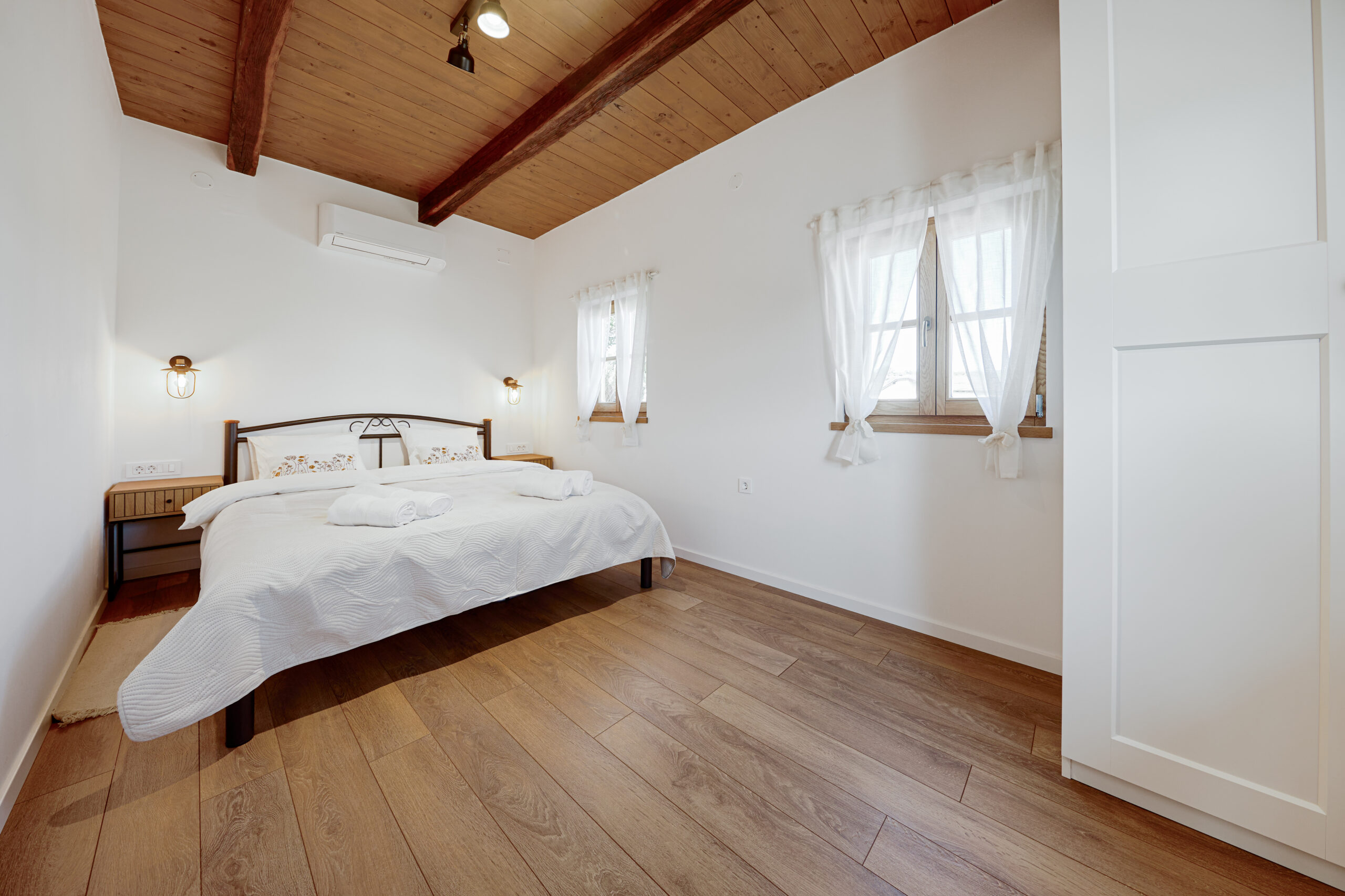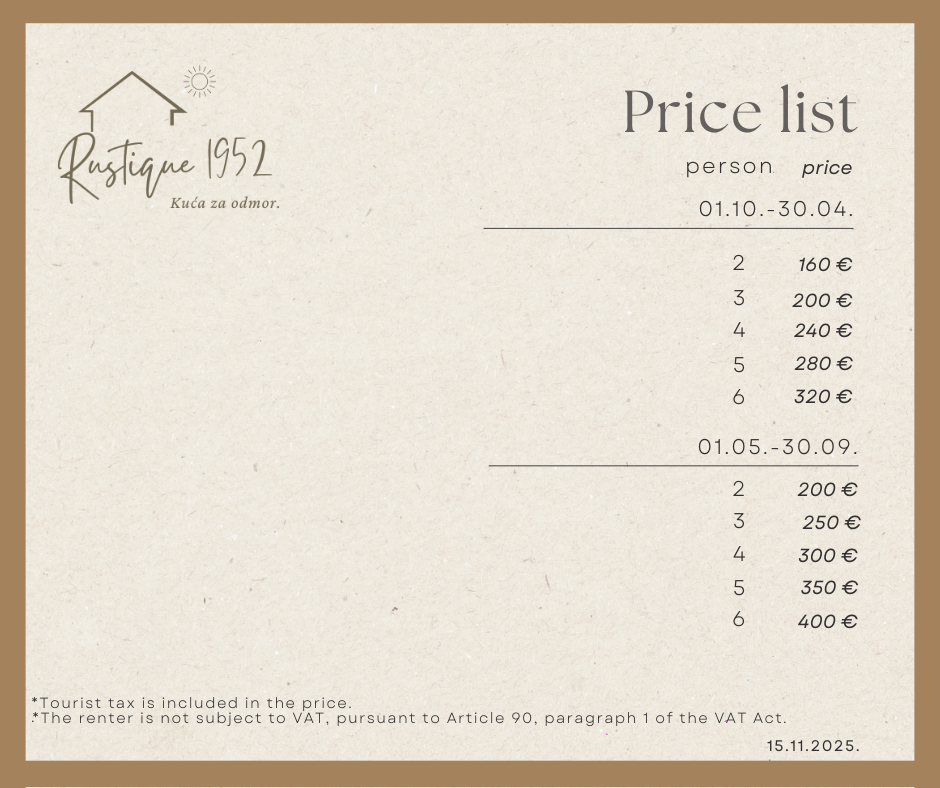 The wooden house is fully equipped for your comfortable stay. The kitchen has all the necessary cooking equipment and appliances. Each guest will be greeted with clean linen, towels, bathrobes and slippers. Each bedroom is equipped with air conditioning and its own TV. The bathrooms are equipped with basic amenities, shampoo, hairdryer… Inside the house there is a wood-burning fireplace and a sauna, and on the outdoor terrace guests will be able to use the barbecue. On the outdoor, covered terrace there is a table, a small kitchen and a toilet. In the courtyard there is a swimming pool and a sunbathing area. The pool is open from April to October.